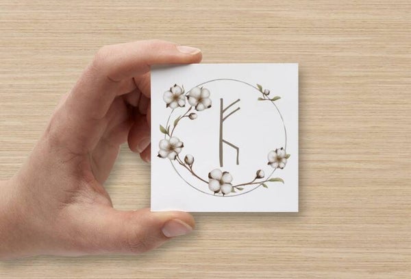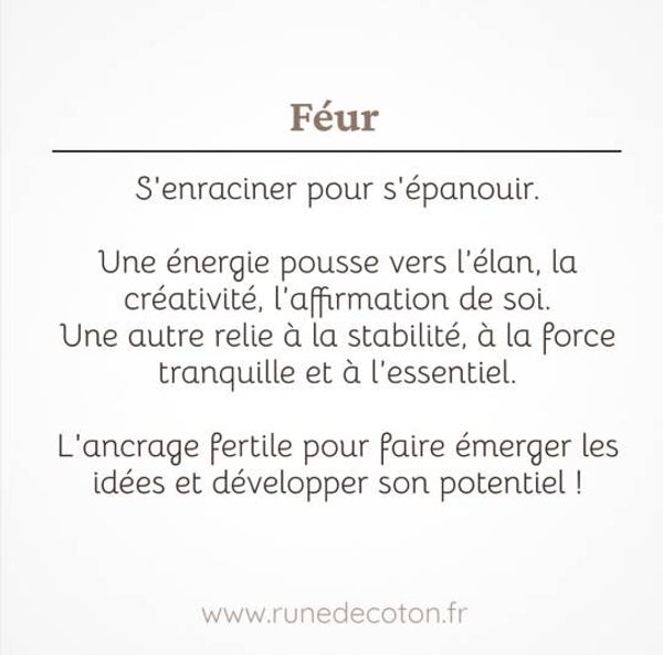 Cette carte carrée (de 7 cm), imprimée sur du papier épais, unit les forces des runes FÉ (mouvement et créativité) et UR (force intérieure et ancrage).