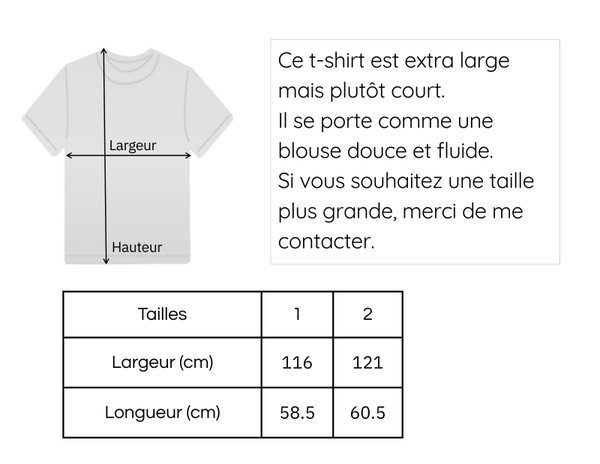 Coupe ample, légèrement courte, à porter comme une tunique bohème ou un t-shirt oversize selon votre humeur.
